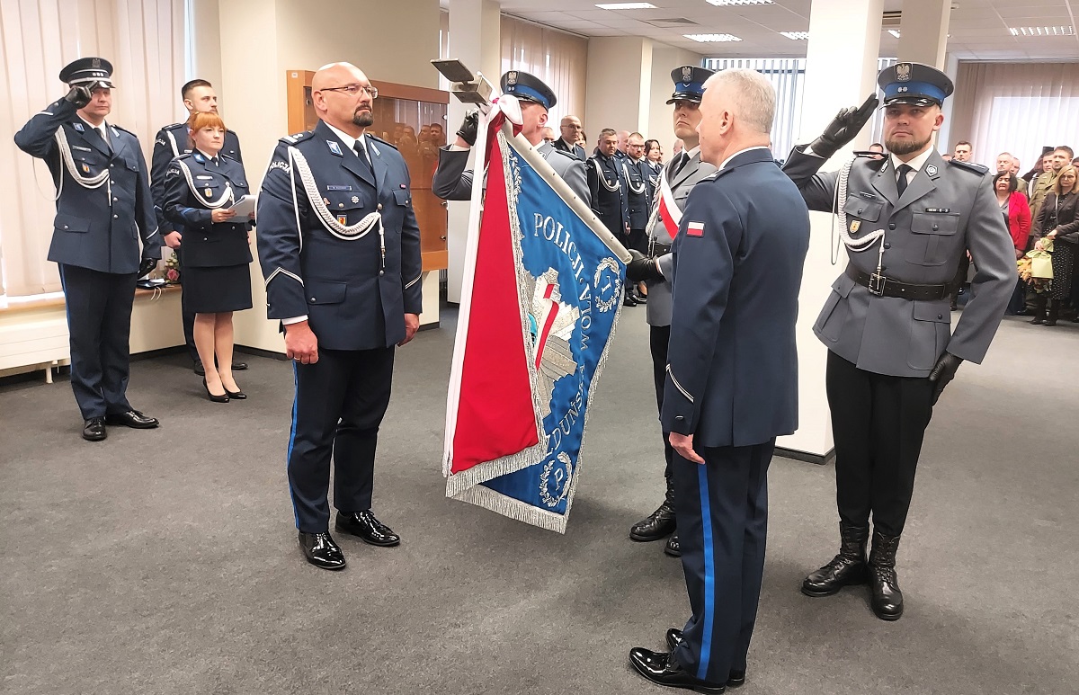 Po odczytaniu rozkazu personalnego o powołaniu młodszego inspektora Marcina Kucnera na stanowisko Komendanta Powiatowego Policji w Zduńskiej Woli, nowy szef zduńskowolskiej jednostki przywitał się ze sztandarem i złożył meldunek o objęciu stanowiska.