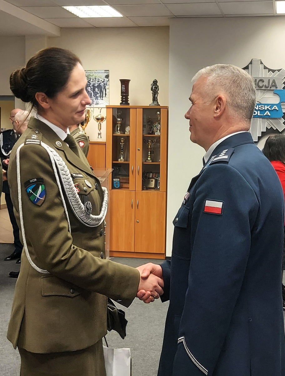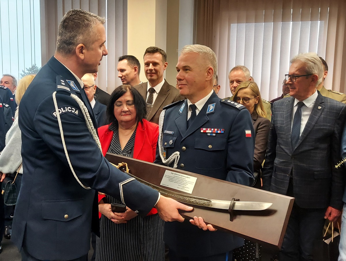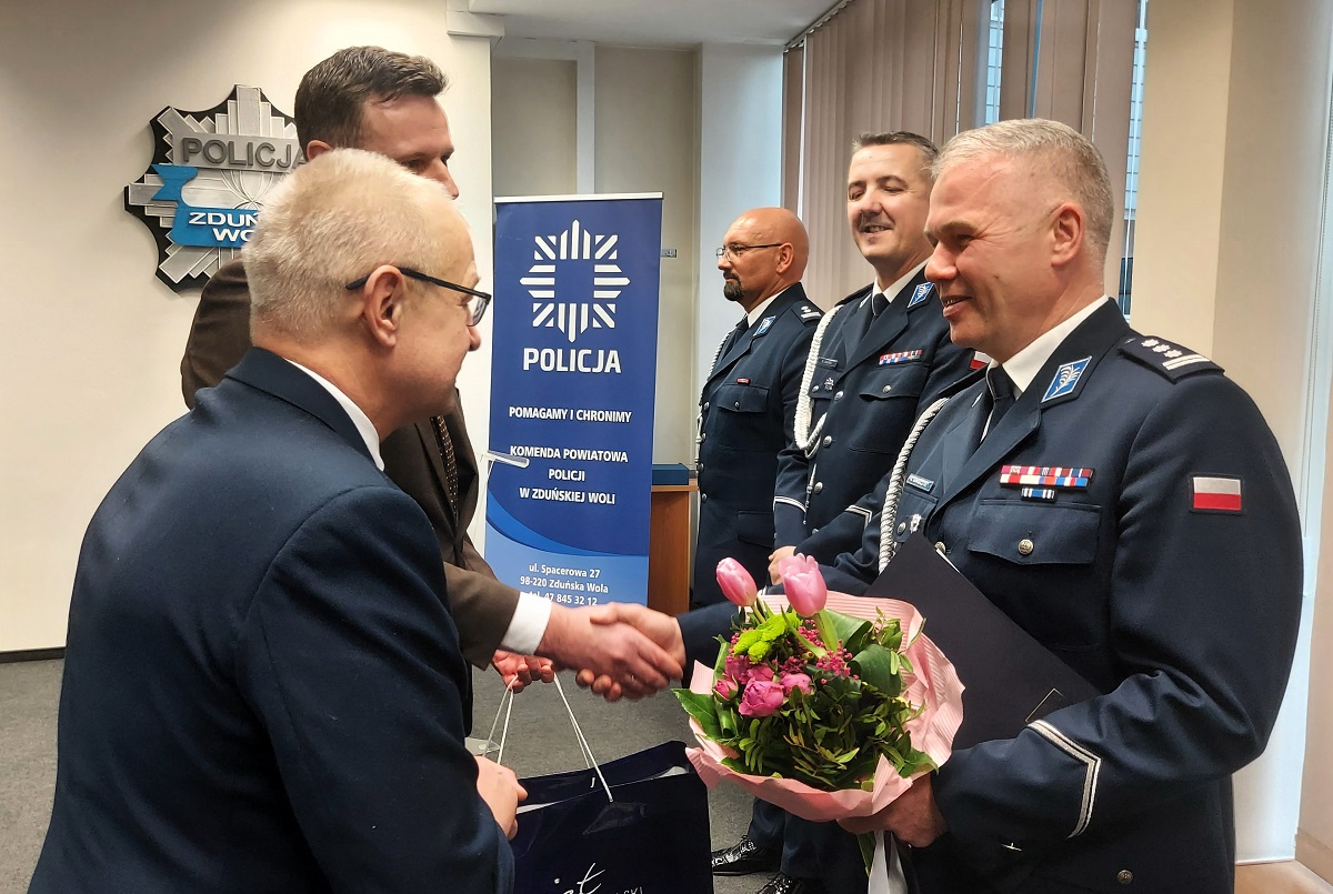 Następnie głos zabrał młodszy inspektor Mariusz Siejka Zastępca Komendanta Wojewódzkiego Policji w Łodzi, który podziękował inspektorowi Robertowi Krawczykowi za 34 lata wzorowej i odpowiedzialnej służby, podkreślając jego profesjonalizm, zaangażowanie oraz wkład w budowanie bezpieczeństwa mieszkańców powiatu zduńskowolskiego i całego garnizonu łódzkiego. Jednocześnie pogratulował młodszemu inspektorowi Marcinowi Kucnerowi objęcia stanowiska Komendanta Powiatowego Policji w Zduńskiej Woli, wyrażając przekonanie, że jego dotychczasowe doświadczenie zawodowe, kompetencje oraz znajomość struktur Policji będą gwarancją stabilnego i skutecznego kierowania jednostką.