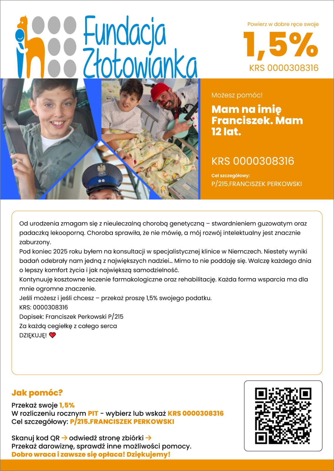 Franek jest synem naszej policjantki ze zduńskowolskiej komendy. Chłopiec urodził się z rzadką chorobą genetyczną jaką jest „stwardnienie guzowate”. Od urodzenia uczęszcza na rehabilitacje, gdzie walczy z obniżonym napięciem mięśniowym. Współistniejącą chorobą jest padaczka lekooporna, która burzy to nad czym na co dzień Franciszek ciężko pracuje. To ona odebrała chłopcu umiejętność mówienia i wyhamowała jego rozwój intelektualny. Pomóżmy Frankowi w walce o zdrowie!