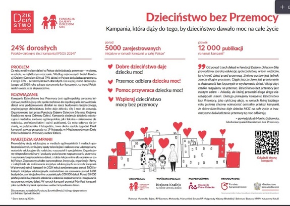 Kampania Dzieciństwo bez Przemocy jest coroczną, ogólnopolską akcją, mobilizującą całe społeczeństwo do zapobiegania krzywdzeniu dzieci oraz podejmowania działań na rzecz budowania bezpiecznego dzieciństwa, które daje dziecku moc. Kampania organizowana jest przez Fundację Dajemy Dzieciom Siłę oraz Krajową Koalicję na rzecz Ochrony Dzieci.